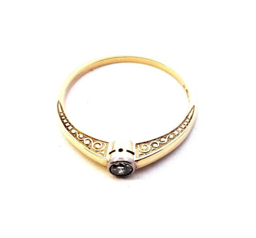 Zlatý prsten o ryzosti 585/1000, velikost 55, váha 2,00 g, punc lvíček, v nejširším bodě 3,5 mm, kámen - diamant - briliantového brusu, staroevropský brus. Celkem cca 0,10 ct.