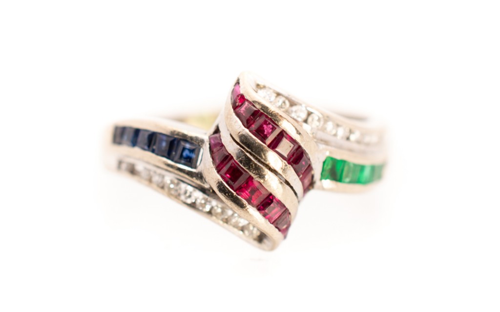 Prsten z bílého zlata s diamanty, rubíny, safíry, vel. 60