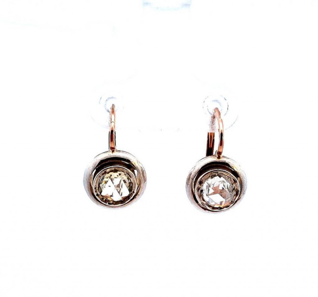 Zlaté náušnice s přírodními diamanty v kombinaci žlutého zlata o ryzosti 583/1000 a stříbra, ve kterém jsou kameny zasazeny o ryzosti 925/1000, osvědčení z PÚ. Na náušnicích je starý ruský punc používaný před rokem 1917. Celková hmotnost 3,65 g. Celkové rozměry 17 x 10 mm. Na náušnicích je cca 0, 67 ct diamantů, posudek ke kamenům viz. foto.