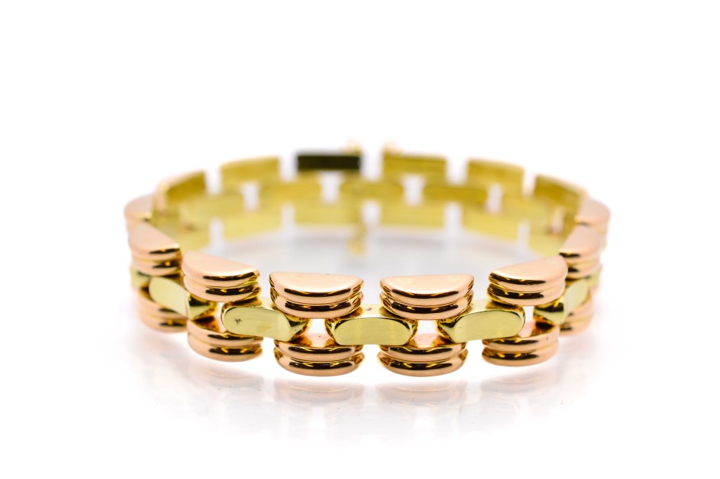 Starožitný zlatý náramek, váha 22,95 g, Ryzost 585/1000, punc lvíček. Kombinace žlutého a růžového zlata. Šířka článku 13 mm, délka náramku 19,5 cm.