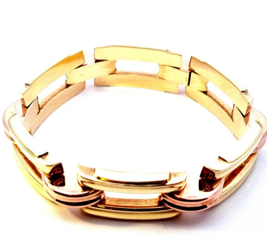 Náramek v kombinaci žlutého a růžového zlata o ryzosti 585/1000, punc lvíček. Váha 29,28 g, délka 18,7 cm, v nejširším bodě 16 mm.