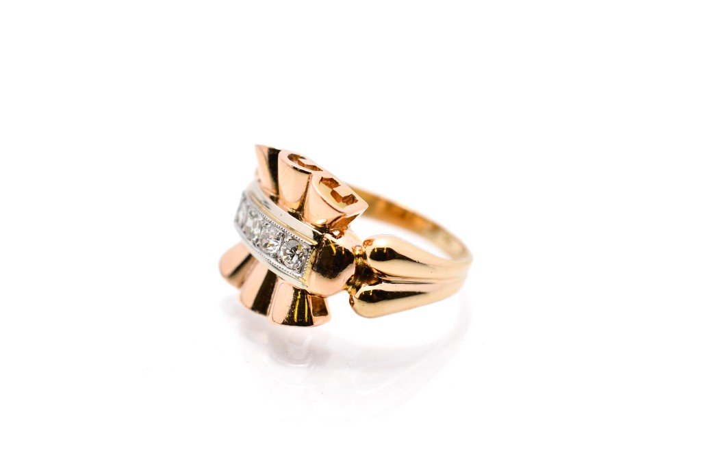Starožitný zlatý prsten s diamanty 1. republika, vel. 53. Ryzost 585/1000, punc lvíček. Váha 7,09 g, v nejširším bodě 14 mm. Celkem 4 ks přírodních diamantů 2 x staroevropský brus, 2 x briliantový brus. Celkem cca 4 x 0,1 ct.