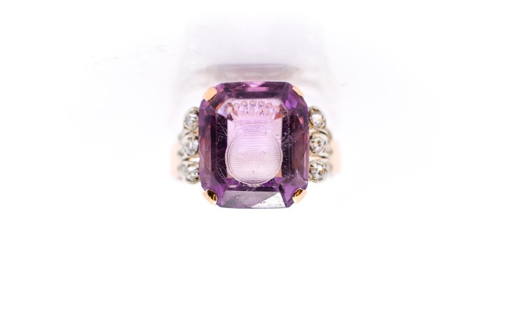 Starožitný zlatý prsten spřírodním ametystem a diamanty, vel. 53. Váha 4,70 g, ryzost 585/1000, punc lvíček. Rozměr ústředního kamene 13 x 6 mm, na kamenu je ozdobná rytina. Jedná se o přírodní ametyst cca 7,5 ct. Po stranách diamanty, staroevropský brus, celkem 6 ks x 0,028 ct. Celkem tedy 0,17 ct.