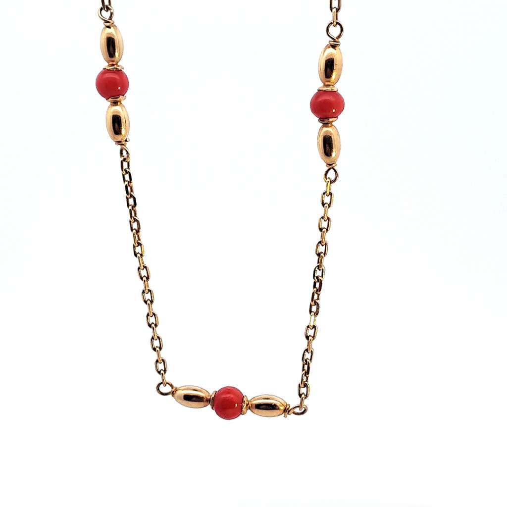 Starožitný zlatý řetízek s korály, 6,80 g, ryzost 585/1000, punc lyra. Délka 44 cm, šířka řetízku 1 mm, průměr korálu 5 mm. Váha 6,80 g.