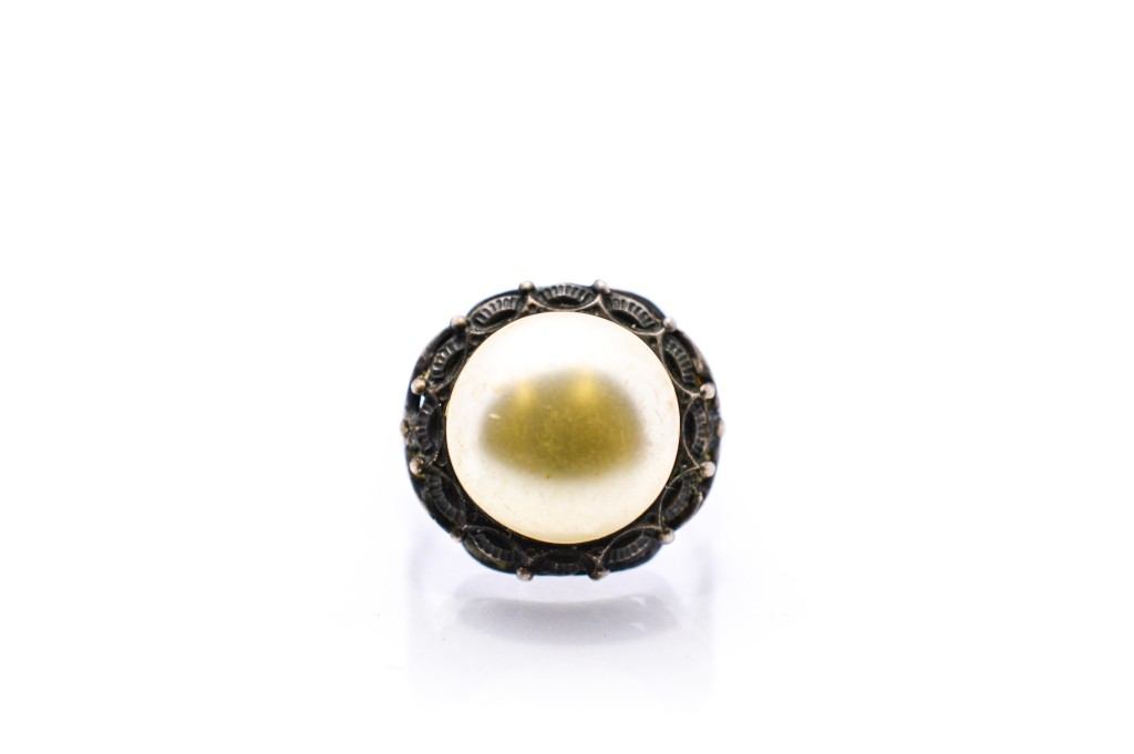 Stříbrný prsten o ryzosti 900/1000, punc zajíc, váha 6,54g, v nejširším bodě 18 mm, průměr perly 14 mm.