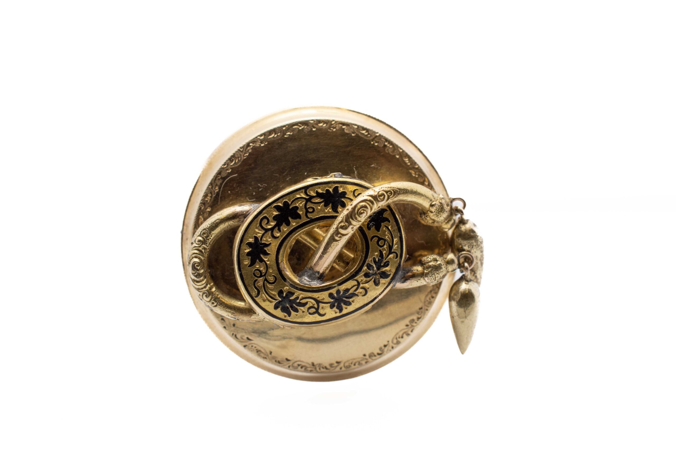Zlatá brož o ryzosti 585/1000, punc - osvědčení z PÚ, váha 6,11 g, výška celkem 45 mm, průměr 35 mm. Jehla je z obecního kovu.