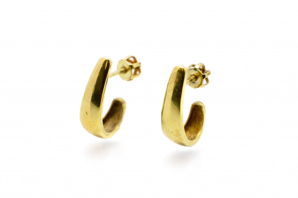 Zlaté náušnice napichovací se šroubovacím zapínáním. Ryzost 585/1000 s puncem labuť. Váha 2,46 g, délka 17 mm, v nejširším bodě 5 mm.