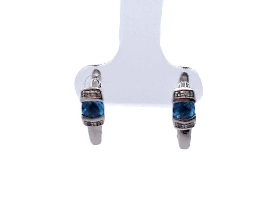 Zlaté náušnice o ryzosti 585/1000, punc labuť. Váha 3,34 g, výška 19 mm, šířka 5 mm. Kámen - topaz, celkem 2 ks, cca 0,40 ct. Kámen - diamant briliantového brusu - celkem 8 ks, cca 0,04 ct.