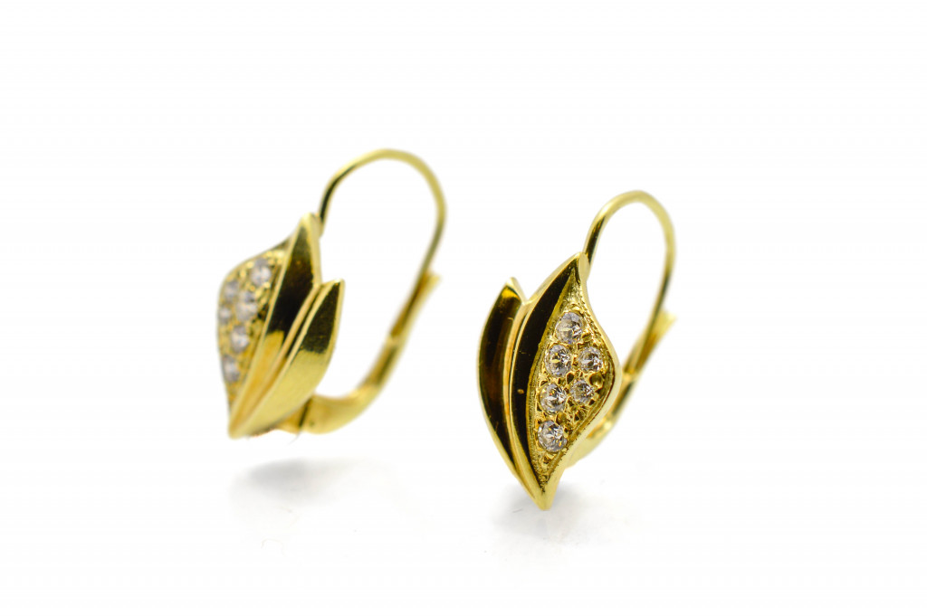 Zlaté náušnice o ryzosti 585/1000, punc labuť. Váha 3,27 g, výška 19,5 mm, v nejširším bodě 9,5 mm.