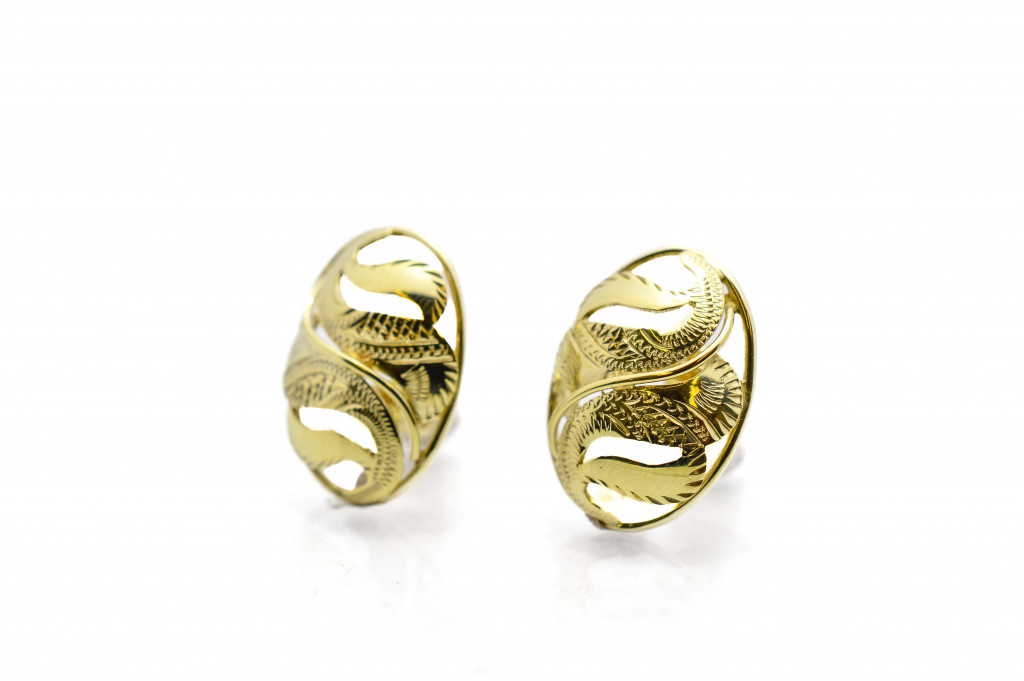 Zlaté náušnice o ryzosti 585/1000, punc labuť. Váha 3,96 g, výška 19 mm, v nejširším bodě 14 mm.