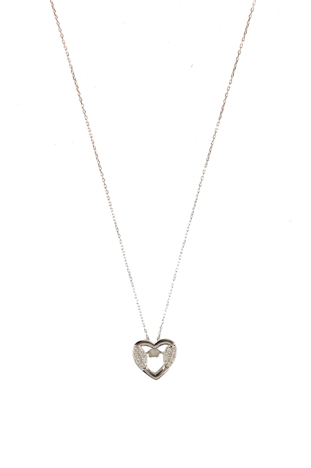 Zlatý kolier z bílého zlata o ryzosti 585/1000, punc labuť, váha 1,74 g, délka 49 cm, šířka řetízku 0,5 mm, rozměr přívěsu 9 x 10,5 mm. Kámen - diamant briliantového brusu - celkem 15 ks, dohromady cca 0,16 ct, barva: G - H, čistota: VS - SI.