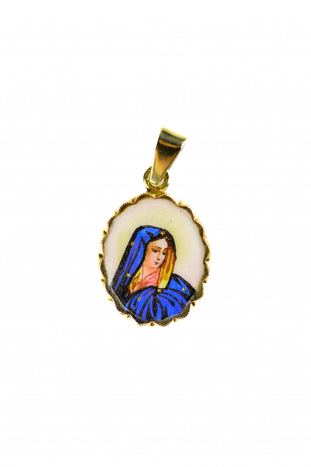 Zlatý medailon s motivem panenky Marie, zasazený v ozdobném reliéfu o ryzosti 585/1000 s puncem labutě. Kápě panenky Marie je zdobena šesti drobounkými zlatými hvězdičkami. Váha 5,89 g, výška včetně očka 34 mm, v nejširším bodě - 20 mm. Rubová strana medailonku nese nápis: " Svatá Maria matko Boží, oroduj za nás."