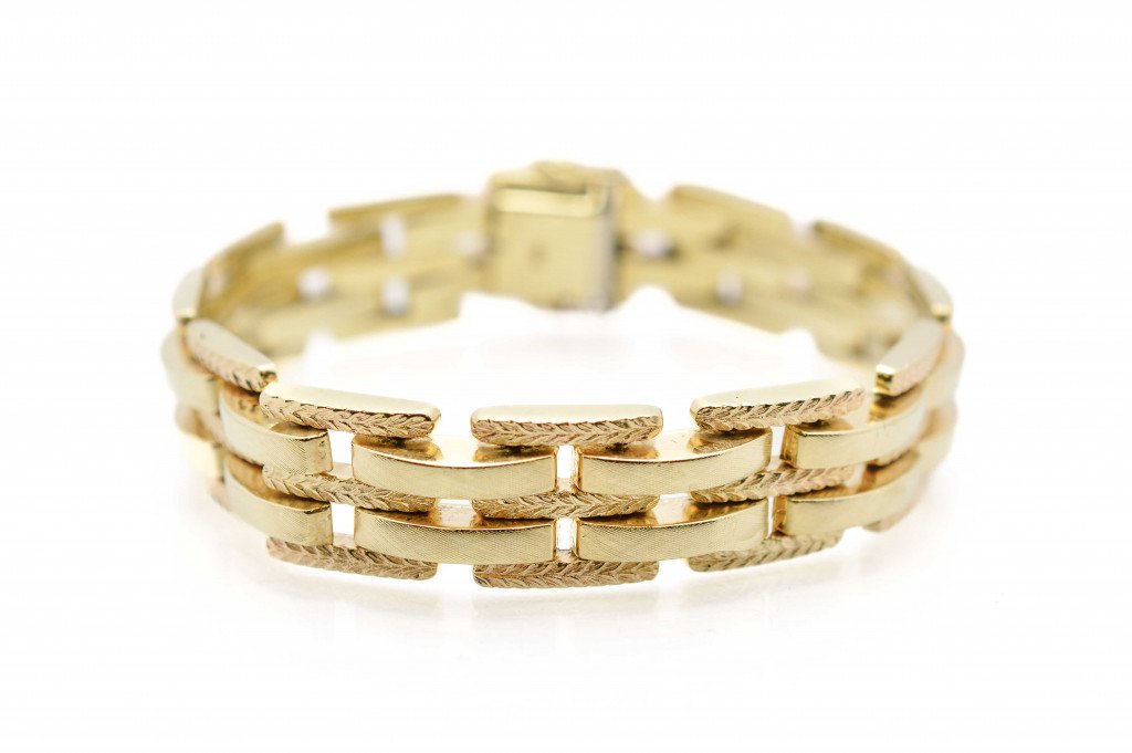 Náramek z kombinace žlutého a růžového zlata o ryzosti 585/1000, punc labuť. Váha 29,93 g, délka 19,5 cm, v nejširším bodě 13,5 mm.