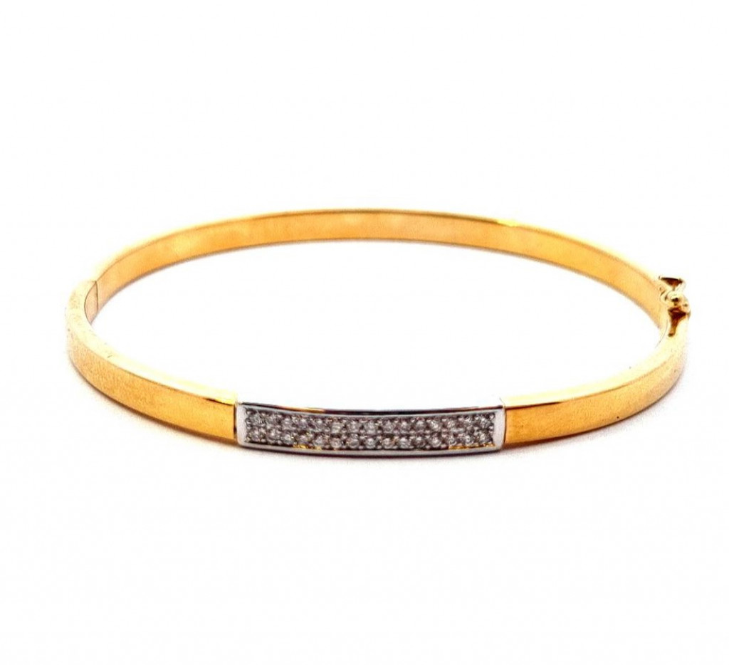 Náramek z kombinace bílého a žlutého zlata o ryzosti 750/1000, punc kohout. Váha 10 g, vnitřní průměr 58 mm, v nejširším bodě 4,5 mm. Kámen - přírodní diamant briliantového brusu - celkem 30 ks, dohromady cca 0,30 ct.