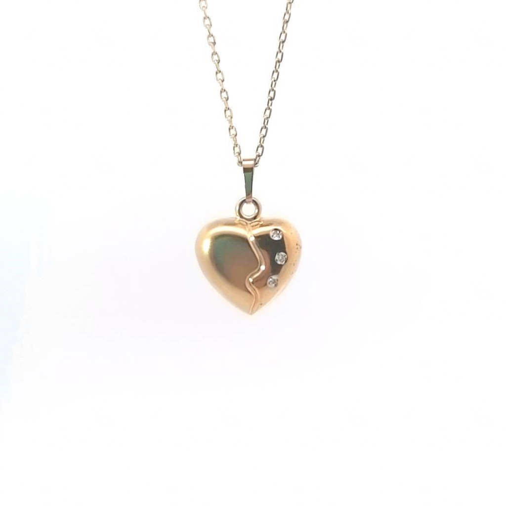 Zlatý přívěs o ryzosti 333/1000, punc platný. Váha 2,49 g, výška včetně očka 27 mm, v nejširším bodě 19 mm. Kameny jsou přírodní diamanty briliantového brusu celkem cca 0,03 ct.