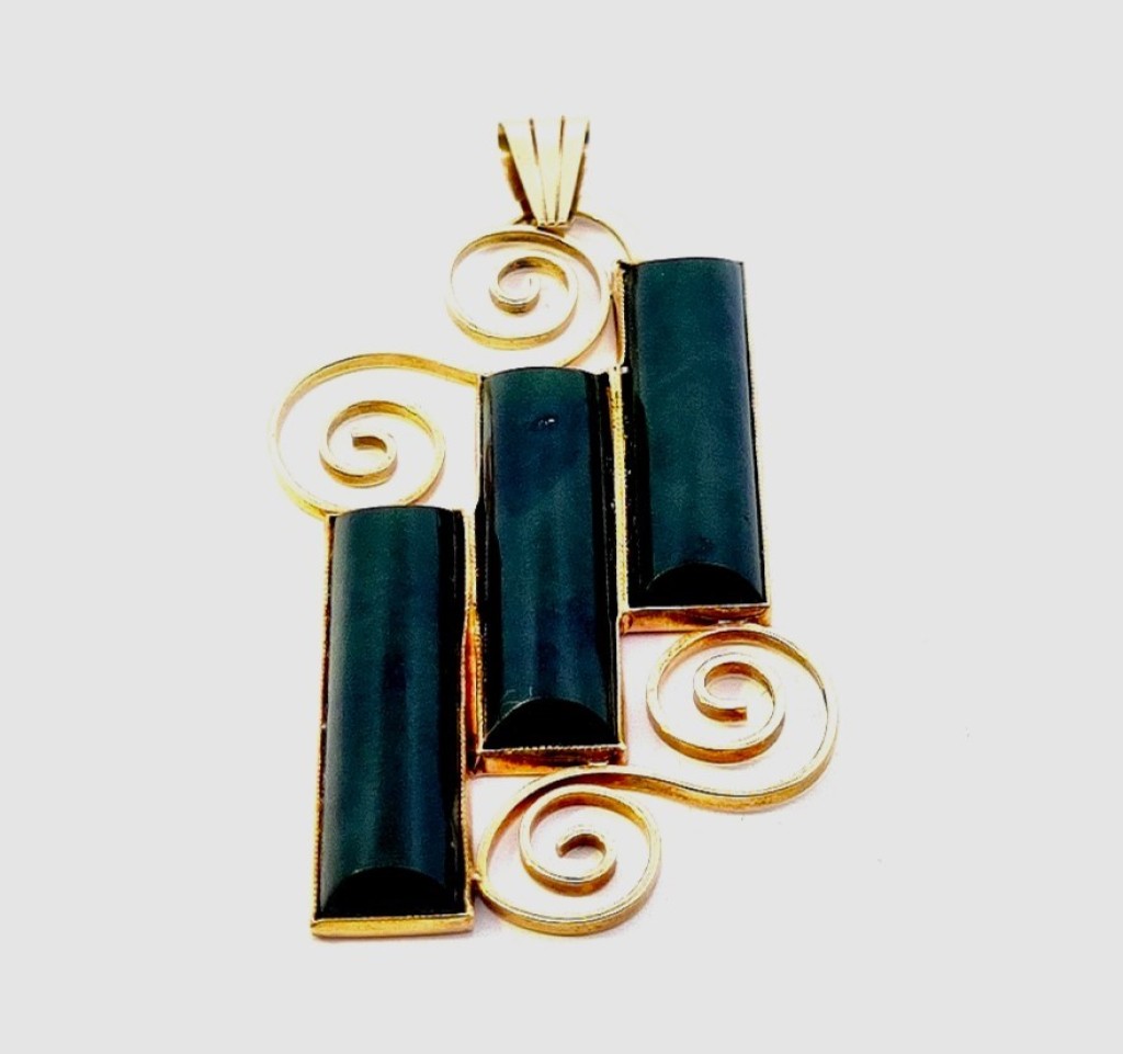Zlatý přívěs o ryzosti 585/1000, punc labuť. Váha 20,15 g, výška i s očkem 70 mm, šířka v nejširším bodě 39 mm.