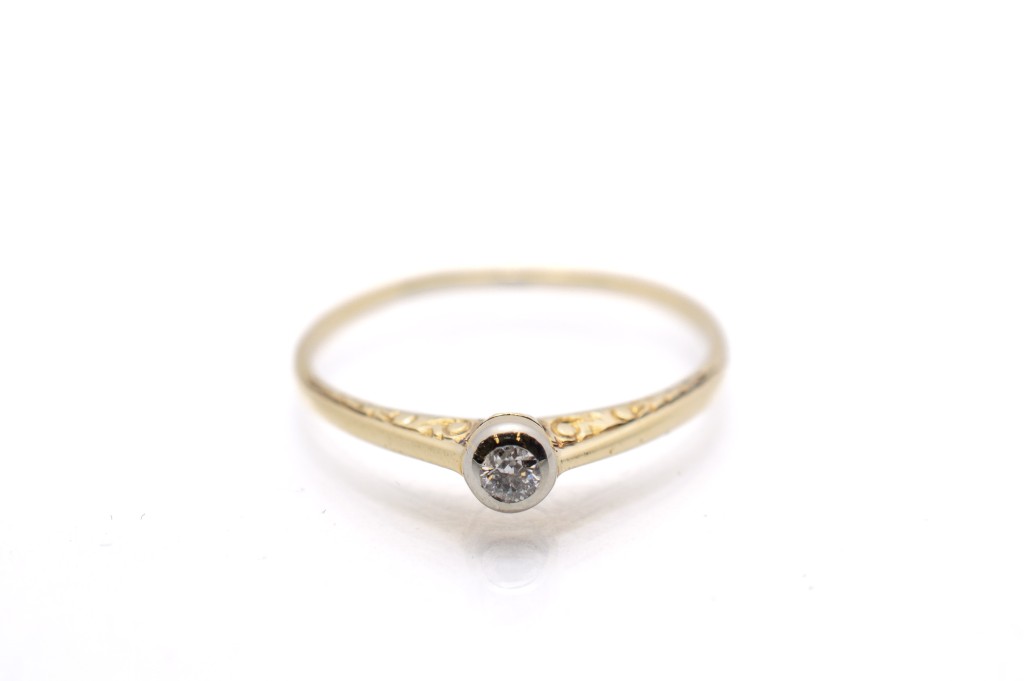 Zlatý prsten s briliantem, první republika, vel. 55, punc labuť, ryzost 585/1000, váha 1,34 g, briliant cca 0,06 ct, staroevropský brus.