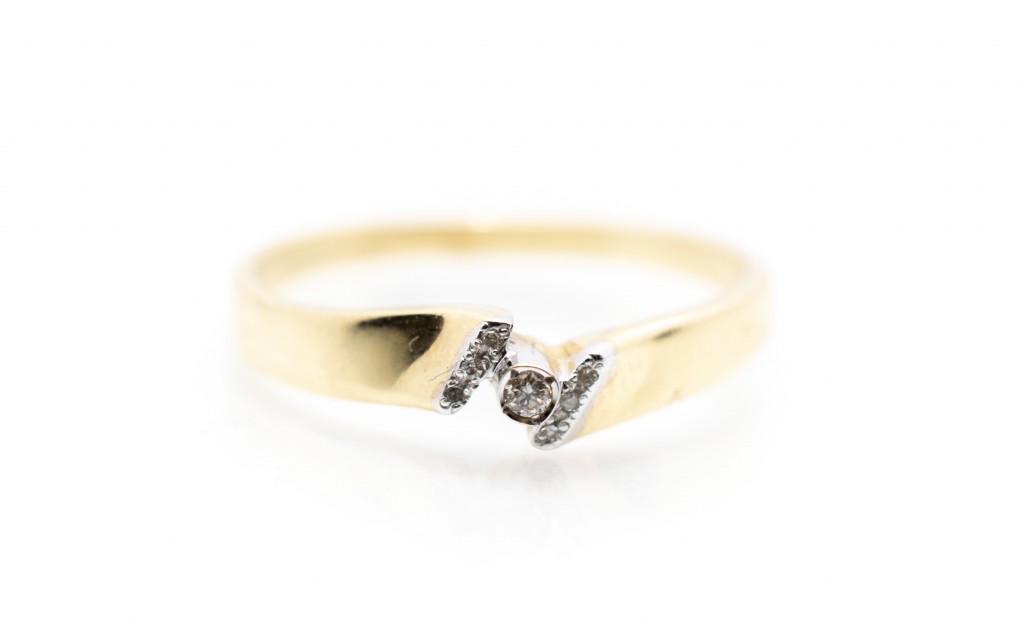 Zlatý prsten o ryzosti 585/1000, váha 2,11 g, velikost 56, punc labuť, v nejširším bodě 6 mm, kámen - celkem 7 ks, centrální kámen cca 0,05 ct.