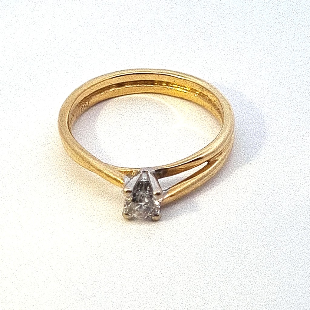 Zlatý prsten o ryzosti 750/1000, punc kohout, váha 3,67 g, velikost 55, v nejširším bodě 3 mm. Kámen diamant briliantového brusu - cca 0,22 ct, kvalita VS2, barva K - L.