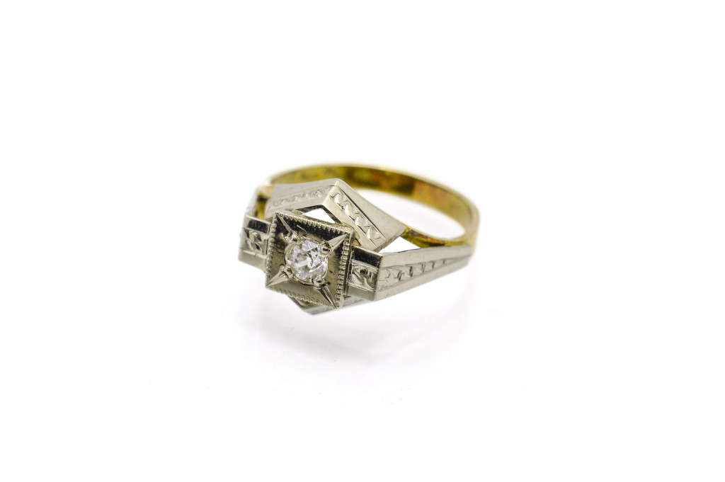 Zlatý prsten s diamantem, vel. 57, ryzost 585/1000, punc čejka. Váha 4,14 g, diamant staroevropského brusu cca 0,18 ct. Kombinace bílého a žlutého zlata, hlava prstenu 12 x 14 mm.