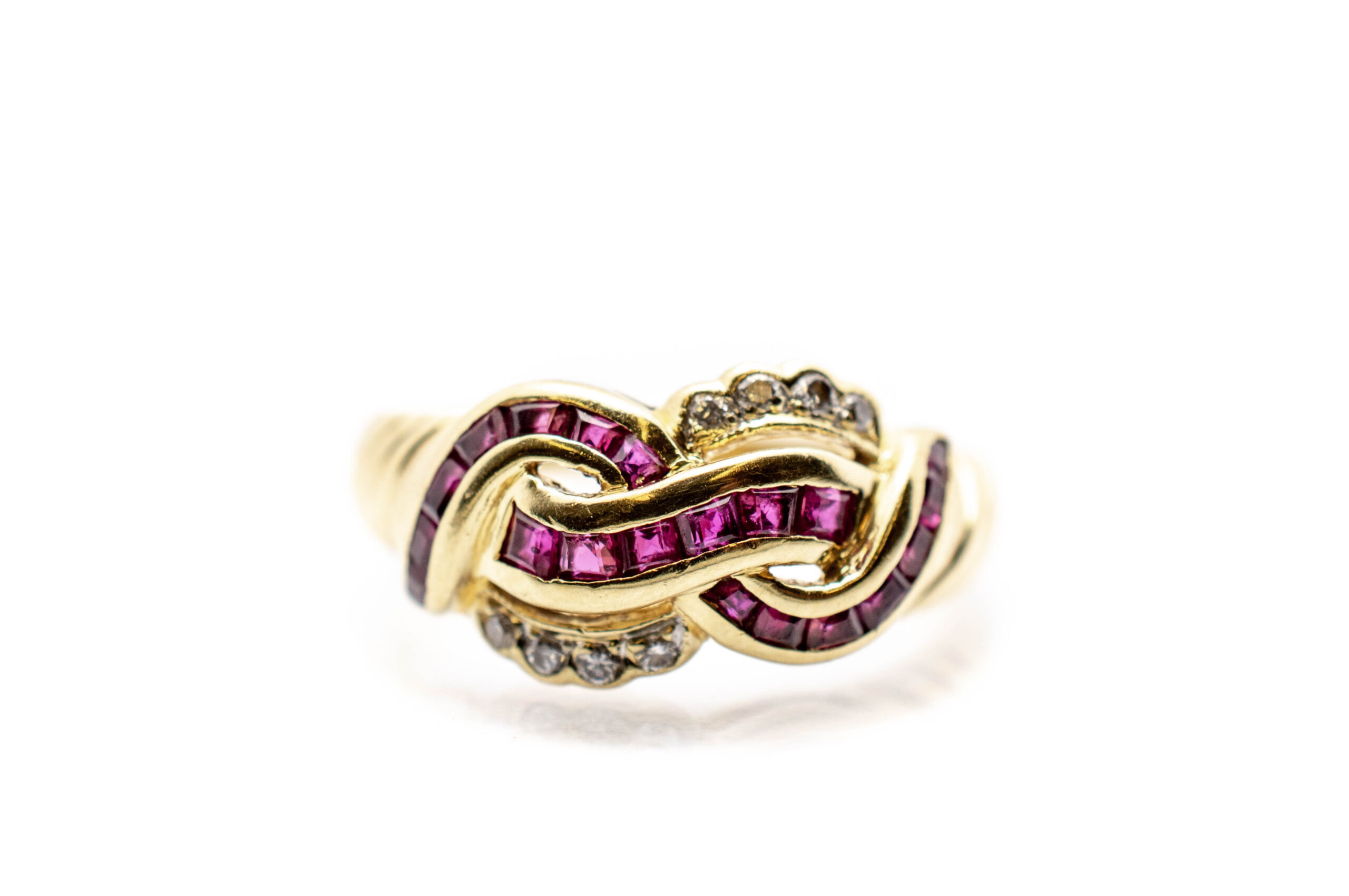 Zlatý prsten o ryzosti 750/1000, váha 3,97 g, punc kohout, v nejširším bodě 17 mm, kámen - diamant briliantového brusu - celkem 8 ks, cca 0,08 ct, rubíny - celkem 20 ks.