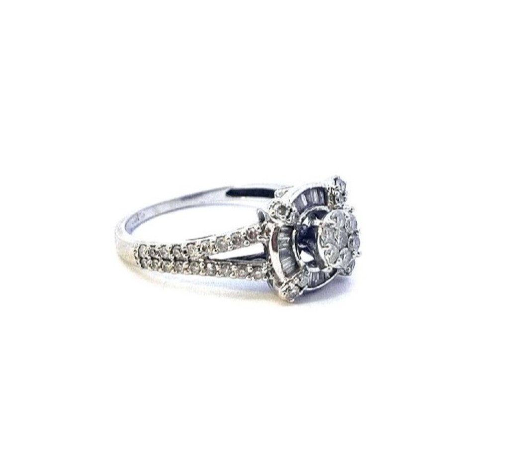Prsten z bílého zlata o ryzosti 750/1000, punc kohout. Velikost 54, váha 6,06 g, v nejširším bodě 12 mm. Kámen - přírodní diamant briliantového brusu - barva: F - H, čistota: VS - SI, dohromady cca 0,93 ct. Jedná se o dvojitý prsten. Tedy dva prsteny, menší a větší viz. foto.