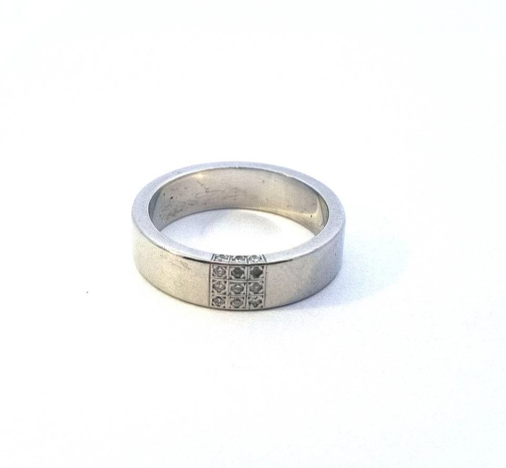 Zlatý prsten s diamanty, vel. 57, váha 7,78 g. Ryzost 585/1000, punc labuť. Na prstenu je celkem 15 ks diamantů cca 0,075 ct. Šířka šíny je 5 mm.