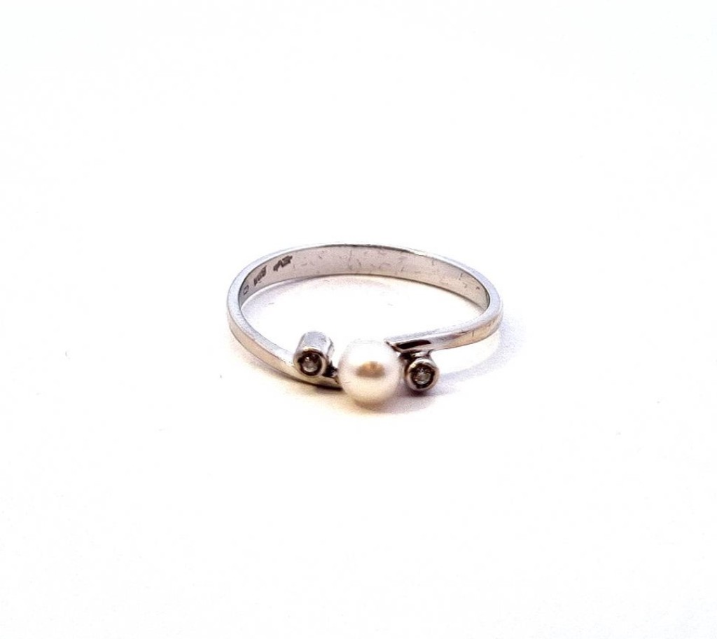 Zlatý prsten z bílého zlata o ryzosti 585/1000, punc labuť. Velikost 54, váha 1,47 g, v nejširším bodě 3,5 mm, průměr perly 4 mm.