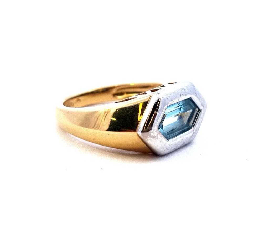 Zlatý prsten o ryzosti 750/1000, punc kohout. Velikost 54, váha 6,55 g, šířka v nejširším bodě 10 mm, rozměry kamene 5 x 11 mm. Topaz je přírodní.