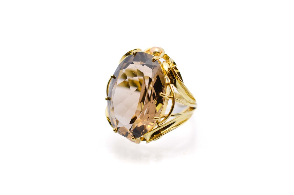 Zlatý prsten o ryzosti 585/1000, punc labuť. Velikost 54, váha 10,15 g, rozměr hlavy prstenu 26 x 20 mm, rozměr kamene 22 x 16 mm. Kámen je syntetický.