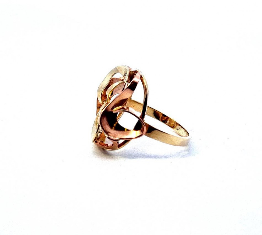 Prsten z kombinace žlutého a růžového zlata o ryzosti 585/1000, punc labuť. Velikost 57, váha 4,33 g, rozměr hlavy prstenu 21 x 21 mm.