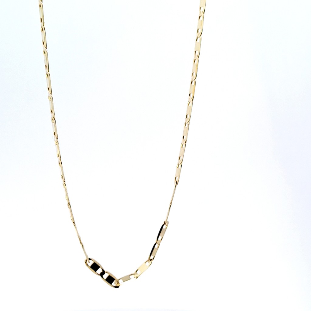 Zlatý řetízek o ryzosti 585/1000, punc labuť. Váha 4,66 g, délka 45,5 cm, šířka 2,5 mm.
